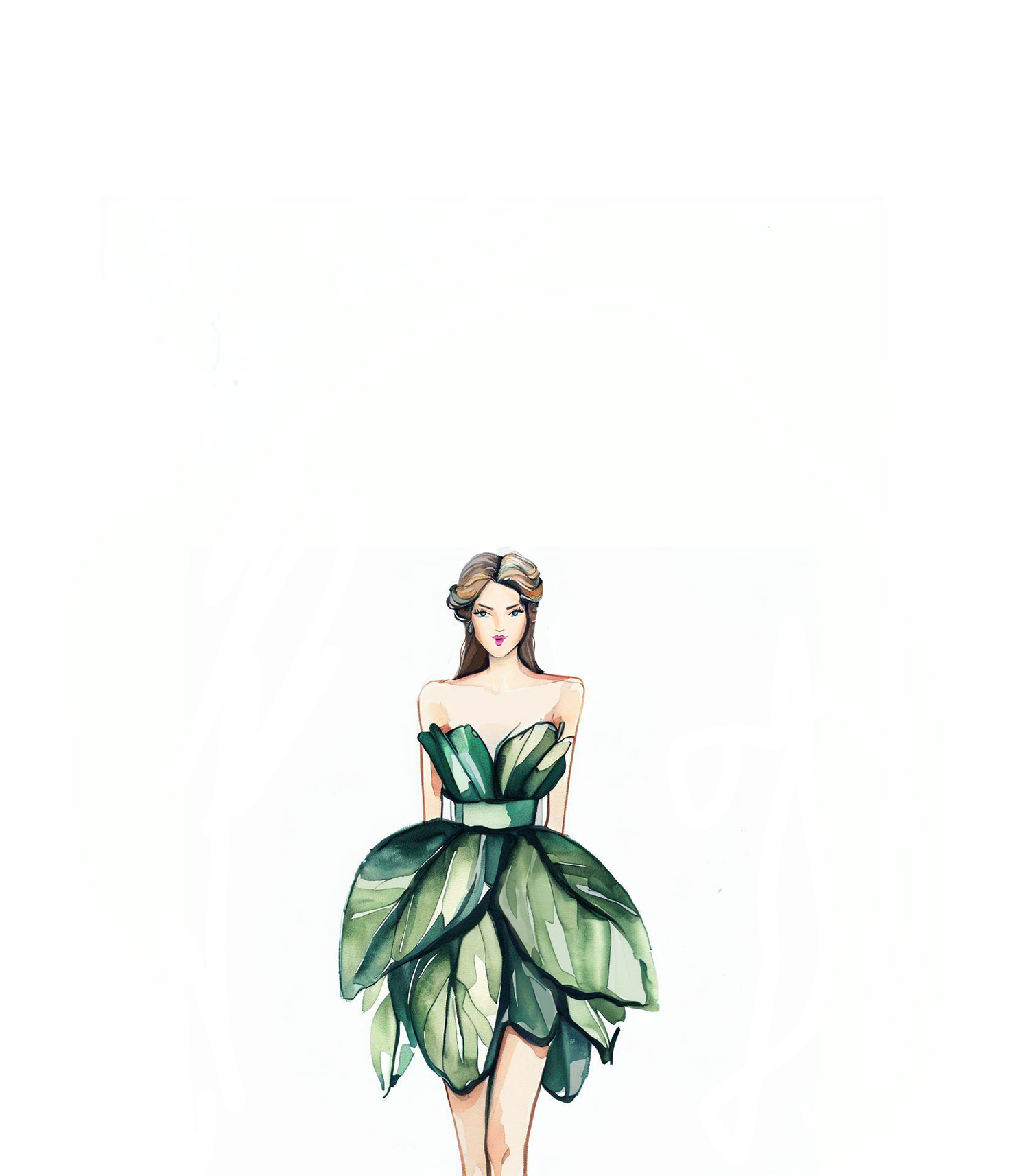 As seen in “Azalea couture,” The fashion illustration “Jungle Baddie,” painted with digital painting, is a continuation of this kinship between femininity and nature as part of a series called "Nature Girlies." This design is a fusion of the big and tough jungle leaves Calidora and Alocasia to form this ethereal sundress. In rendering this, I drew inspiration from Tash Sultana’s dynamic song “Welcome to the Jungle.”